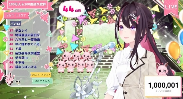 아즈키는 지난 27일, 구독자가 약 99만6000명인 시점에 '100만명 대기 기념 100곡 연속 부르기' 방송을 시작했다. 44번째 곡을 부르던 와중 100만 구독을 달성했으며 이후로도 노래 방송을 진행, 약 7시간에 걸쳐 100곡을 모두 부르고 방송을 마무리했다.