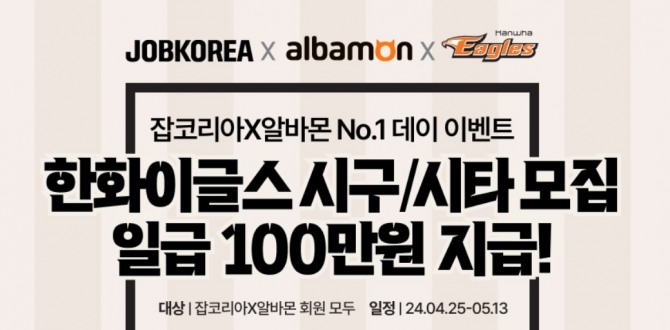 김태현 잡코리아 브랜드마케팅팀 팀장은 "한화이글스 스폰서십을 기념해 잡코리아와 알바몬 회원들과 즐거운 경험을 나누고자 이색 채용 이벤트를 마련했다"며 "하루 100만원의 높은 급여를 받을 수 있을 뿐 아니라 한화이글스 홈구장에서 직접 시구와 시타를 해 볼 수 있는 특별한 기회를 얻을 수 있는 만큼 이색 채용 공고에 많은 관심과 지원을 부탁드린다"고 말했다.