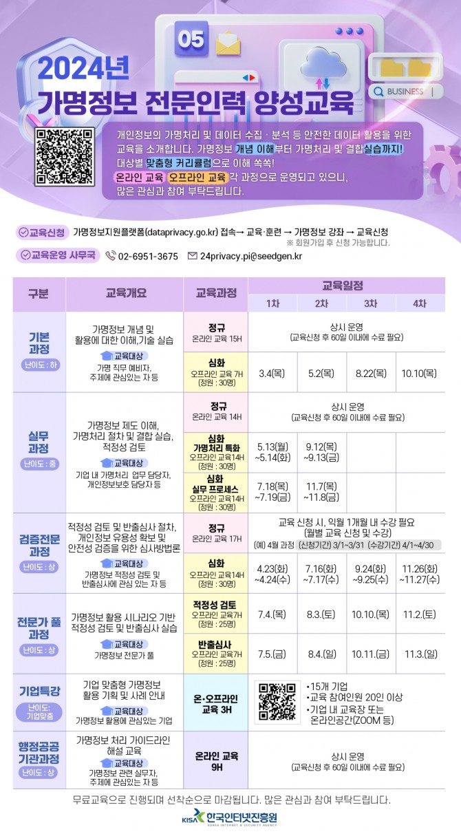 특히, 기존에는 분기별로 오프라인 일정에 맞추어 온라인 교육을 진행했으나 올해는 온라인 과정을 별도로 개설하여 언제 어디서나 상시 학습이 가능하다. 아울러 개정 가명정보 처리 가이드라인 주요 내용을 소개하는 가명정보 행정·공공기관 과정을 온라인으로 신설했다.