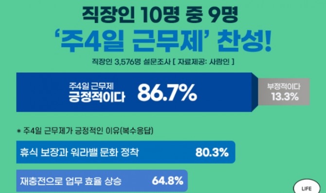 주4일제가 긍정적인 이유는 '휴식권이 보장되고 일과 삶 균형(워라밸)이 정착될 수 있어서'(80.3%, 복수응답)가 1위였다. 다음으로 '재충전으로 업무 효율이 높아질 것 같아서'(64.8%), '건강 관리에 도움이 될 것 같아서'(44.6%), '휴일이 늘어 내수 진작과 경제 성장이 기대돼서'(33%) 등의 답변이 이어졌다.