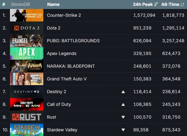 6월 2일 기준 스팀 게임들의 최다 동시 접속자 순위. 화살표는 5월 26일 대비 순위 변동을 표시한 것. 사진=스팀 데이터베이스