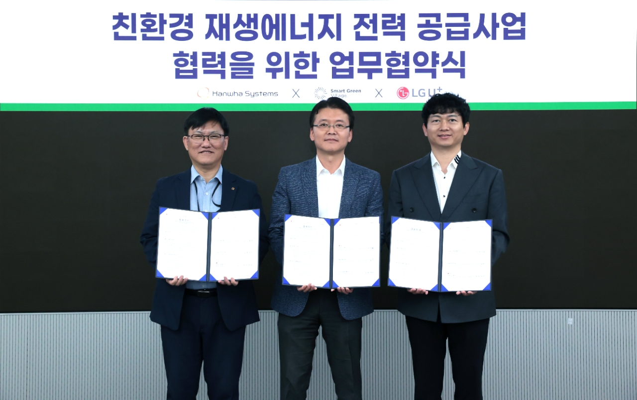 이미지 확대보기LG유플러스는 태양광 발전 사업 컨설팅 기업 스마트그린빌리지, 태양광 발전소 인프라 기업 한화시스템과 함께 재생에너지 공급 사업협력을 위한 업무협약을 체결했다고 20일 밝혔다.