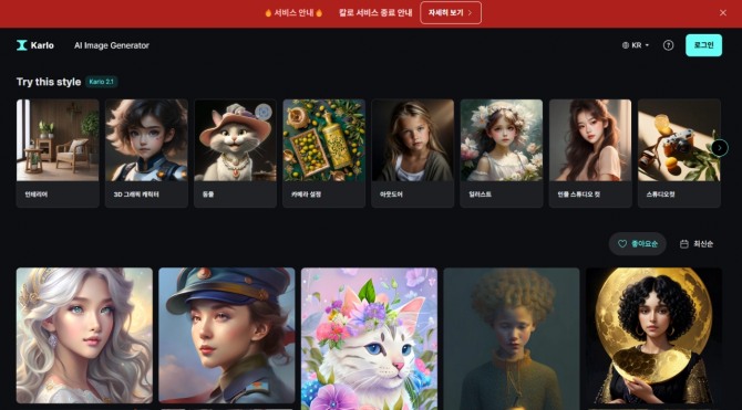 서비스 7개월 만에 카카오는 새로운 AI 서비스 방향성에 맞는 '서비스 재정비'를 사유로 종료 방침을 밝혔다. 새로운 변화를 위한 결정이라고 덧붙이며 사용자들에게 양해를 구하는 모습이다. AI 이미지 신규 생성은 오는 7월 24일 오후 3시까지 가능하며 칼로 서비스의 완전한 종료는 2024년 10월 31일이다. 칼로 서비스를 통해 생성한 AI 이미지는 서비스 종료 시점 내 다운로드하지 않으면 모두 삭제돼 복구할 수 없다.