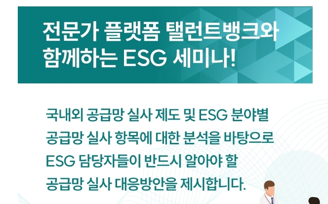 'ESG 공급망 실사에 대한 실효적 대응방안'을 주제로 대기업이 공급망 실사에서 어떤 항목을 중요하게 생각하고, 협력사 담당자들이 꼭 알아야 할 대응방안은 무엇인지 살펴볼 수 있을 전망이다.