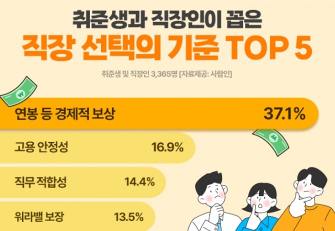 이미지 확대보기커리어 플랫폼 사람인이 취준생 및 직장인 3365명을 대상으로 '직장을 선택할 때 가장 중요하게 생각하는 조건'을 조사한 결과, '연봉 등 경제적 보상'이 1위(37.1%)로 집계됐다. 다음으로, '고용 안정성'(16.9%), '직무 적합성'(14.4%), '워라밸 보장'(13.5%), '성장 가능성'(6.1%) 등의 순이었다.