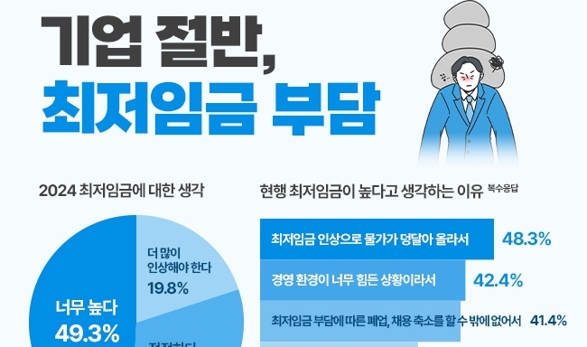 이어 '경영 환경이 너무 힘든 상황이라서'(42.4%), '최저임금 부담에 따른 폐업, 채용 축소를 할 수밖에 없어서'(41.4%), '지난해 이미 최저임금이 너무 많이 올라서'(32.6%), '현재 경제 상황에 맞지 않아서'(29.4%) 등을 선택했다.
