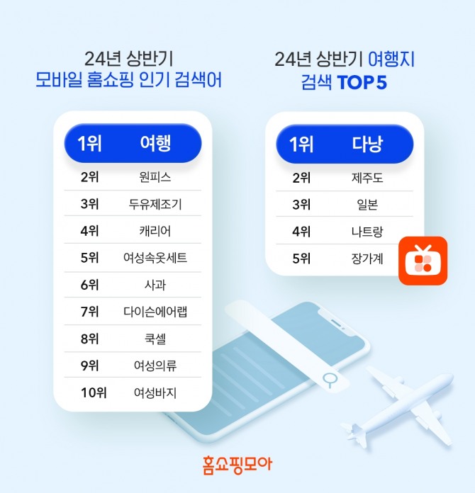 이미지 확대보기홈쇼핑모아는 올해 1월부터 6월까지 홈쇼핑모아 이용자의 검색어를 분석한 결과 '여행'이 최다 검색어로 선정됐다. 그밖에 '원피스', '두유제조기', '캐리어', '여성속옷세트' 순으로 높은 검색량을 기록했다.