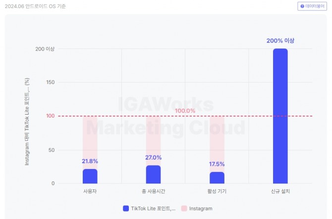 안드로이드 OS 사용자 기준, 경쟁 앱인 인스타그램 대비 6월 신규 설치는 200% 이상 증가했다. 월평균 사용자의 경우 4월 117만 명에서 5월 235만명으로 2배 이상 증가했으며 6월에는 48만명 증가한 283만 명을 기록했다.
