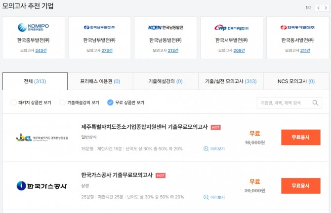 이 외에도 잡코리아는 취업포털 최초로 공기업 기출/실전/NCS 모의고사와 기출해설 강의를 제공한다. 무료로 응시할 수 있는 상품들만 볼 수 있는 기능도 따로 제공해 공기업 입사를 준비하는 이들에게 유용하게 쓰이고 있다.