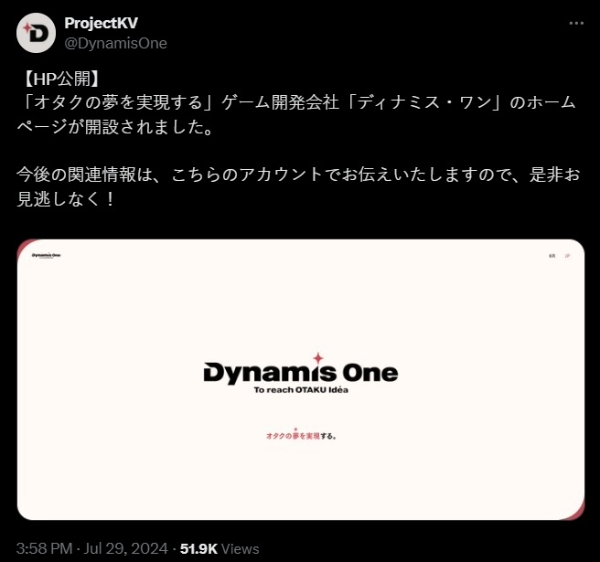 X(트위터)에는 29일 닉네임 프로젝트KV, 계정명 DynamisOne가 게시물을 게재했다. 해당 게시물은 일본어로 "오타쿠의 꿈을 실현하는 게임 개발사 '디나미스 원'의 홈페이지가 개설됐다"며 "향후 관련 정보를 해당 계정으로 알려드리겠다"고 밝혔다.