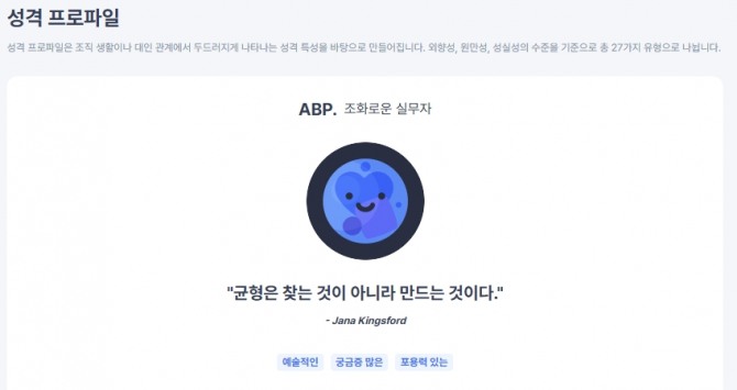 132문항의 질문에 모두 답하면 마치 MBTI와 같이 27가지 유형으로 나눠진 '성격 프로파일'을 먼저 확인할 수 있다. 조직 생활, 대인 관계에서 두드러지는 이용자의 성격 특성을 분석해 특정 유형으로 분류해 준다.