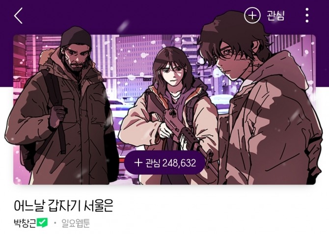 하일권 작가의 '방과후 전쟁활동', 김칸비·황연찬 작가의 '스위트홈', 이명재 작가의 '위아더좀비', 이연 작가의 '살아남은 로맨스' 등을 재미있게 본 독자들이라면 '어느날 갑자기 서울은' 또한 즐겁게 감상할 수 있을 것이다. 1부와 외전, 현재 연재 중인 2부를 포함해 모두 142편이 공개된 '어느날 갑자기 서울은'은 매주 일요일 네이버 웹툰을 통해 접할 수 있다.