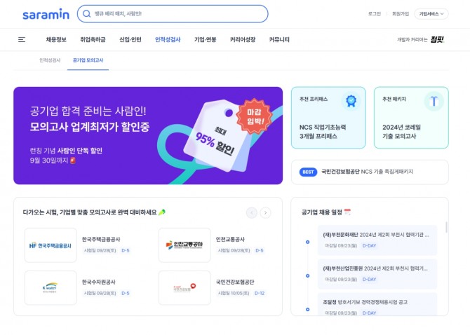 사람인은 하반기 채용시즌을 맞은 취준생들을 위해 공기업 모의고사 서비스 론칭 프로모션도 실시한다. 개별 회원 ID 당 1회씩 모의고사 무료 체험 기회를 준다. 또, 오는 9월 30일까지 상품별로 정가 대비 약 20%에서 최대 95%까지 할인한 가격에 제공한다. 국내 최저가로 거의 모든 모의고사 상품들을 제공해 다양한 기업의 입사를 준비하는 취준생들도 적은 부담으로 필기시험 대비가 가능하다.