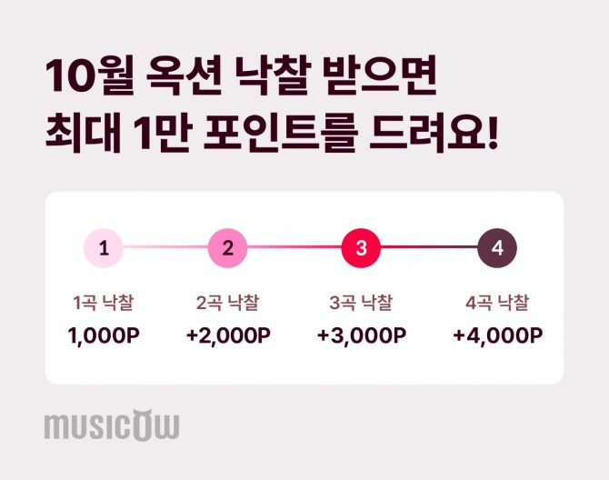 이미지 확대보기뮤직카우는 10월 옥션 미션을 진행하고 포인트의 혜택을 제공한다. 1곡 낙찰 시 기본으로 1000 포인트를 지급하며, 2곡 낙찰 시 2000 포인트, 3곡 낙찰 시 3000 포인트, 4곡 낙찰 시 4000 포인트를 추가로 지급해 낙찰곡 수에 따라 최대 1만 포인트를 지급한다. 10월 첫 번째 옥션곡인 티삼스 ‘매일 매일 기다려’ 옥션은 10일 오후 9시에 종료되며, 11일부터 후속 옥션이 차례로 오픈 될 예정이다.