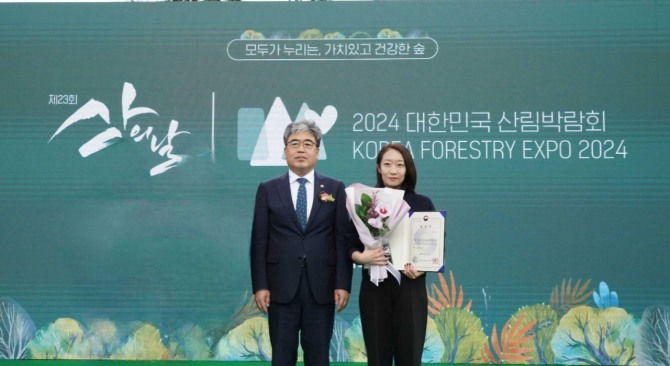 지난 18일 경주 엑스포 공원에서 개최된 ‘산의 날’ 기념식에서 두나무가 농림부 장관상을 수상하고 있다. (임상섭 산림청장(왼쪽), 이수민 두나무 ESG팀 실장). 사진=두나무이미지 확대보기