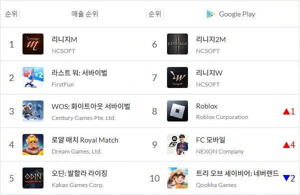 엔씨소프트(NC)의 '리니지M'과 퍼스트펀 '라스트 워: 서바이벌' 등 매출 톱7 게임의 면면에는 변화가 없었다. 지난주 매출 10위였던 호요버스 '원신'은 이번주 들어 매출 29위로 자리를 옮겼다.