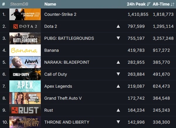 크래프톤의 '펍지: 배틀그라운드'와 스팀 운영사 밸브 코퍼레이션의 '도타 2'가 2위 자리를 두고 경쟁하는 등, 최상위권에서 소폭 순위 변동이 적지 않게 일어났다. 액티비전의 '콜 오브 듀티'도 '블랙 옵스 6' 출시 후 3주 만에 5위 자리를 넷이즈 '나라카: 블레이드 포인트'에 내줬다.