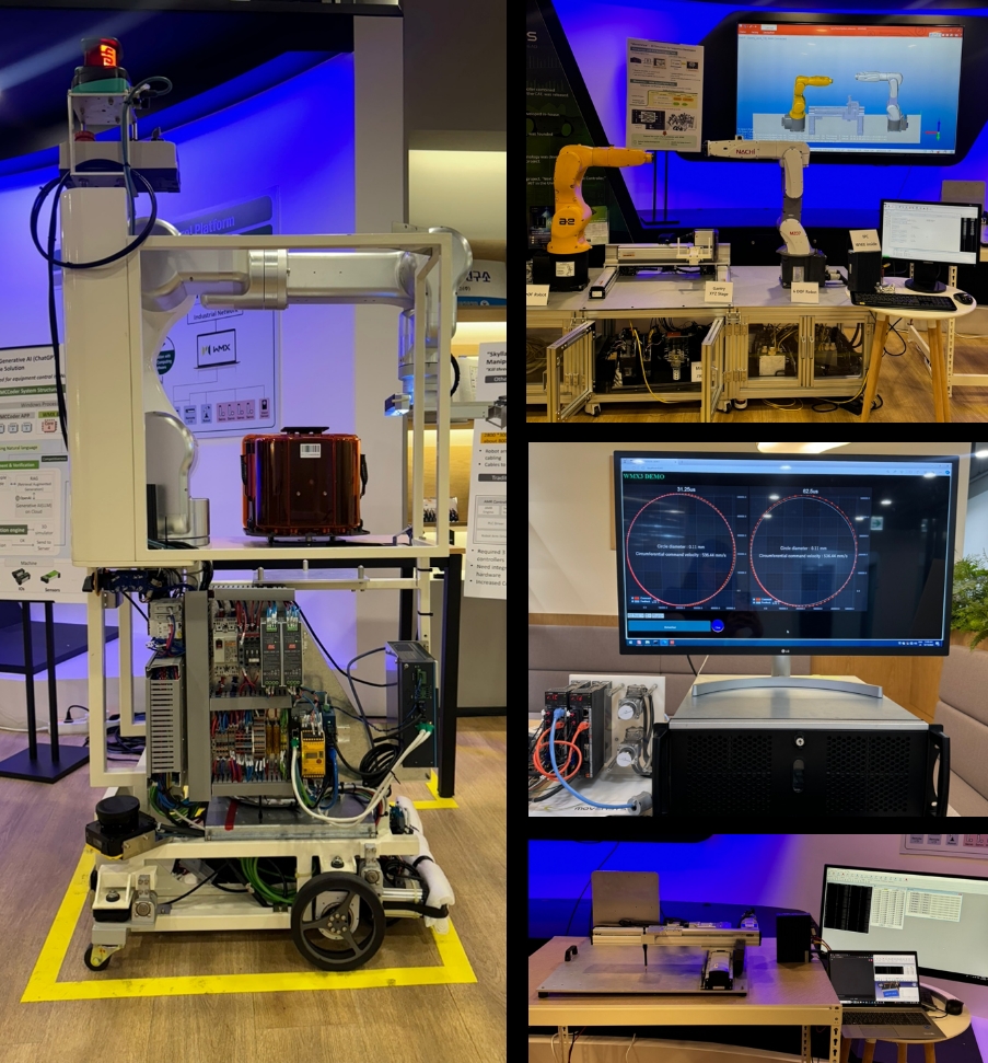 두 번째 데모는 하나의 WMX 소프트웨어를 통해 이종 로봇 및 서보 간의 고정밀 동기 제어를 구현한 것이다. 일반적인 6축 로봇의 전용 하드웨어 제어기 없이 WMX만으로 그 이상의 고정밀 동기 제어를 실현한 것이 가장 큰 차별점이다.