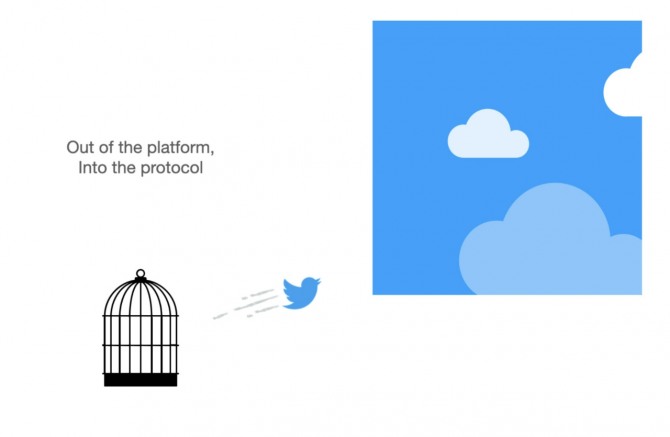 이미지 확대보기-제이 CEO가 트위터 재직 시절 진행한 프리젠테이션 이미지로 폐쇄적인 플랫폼에서 벗어나 블루스카이의 개방형 생태계로 날아가는 트위터 새 이미지를 사용했다.
