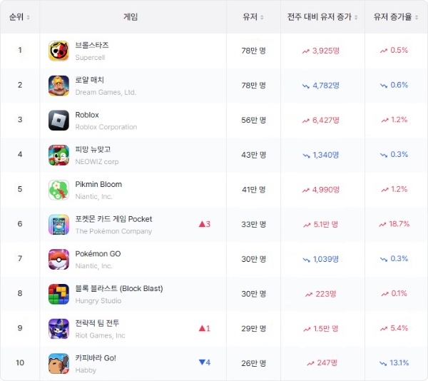 포켓포켓이 인기를 얻음에 따라 꾸준한 인기를 자랑하는 '포켓몬 고', 올해 들어 여성 게이머 중심으로 인기를 얻은 '피크민 블룸'을 더해 닌텐도 IP 기반 모바일 게임 3종이 5위와 6위, 7위를 차지했다. 세 게임의 WAU를 더하면 100만명 이상이 닌텐도 IP 기반 모바일 게임을 플레이했다.