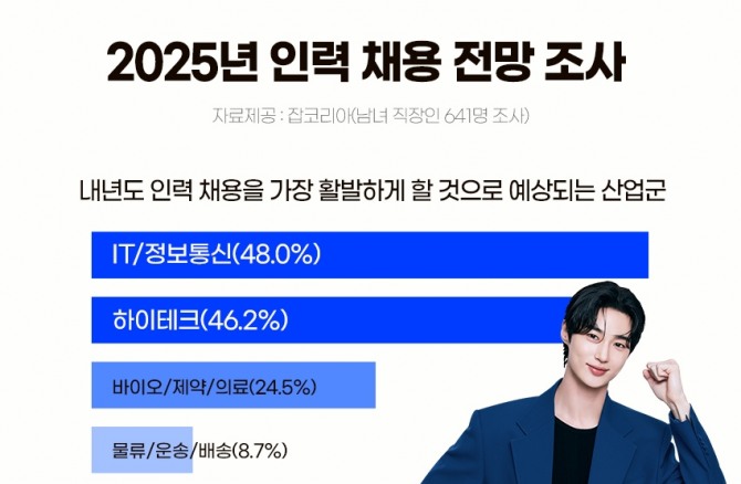직장인들이 내년도 채용을 가장 활발하게 할 것이라 기대하는 산업군(복수응답)은 △IT/정보통신과 반도체, 2차전지, 디스플레이 등 △하이테크 분야를 각 응답률 48.0%와 46.2%순으로 확인됐다. 다음으로 △바이오/제약/의료(24.5%)분야에서 인력 채용이 활발할 것이라고 답했다.