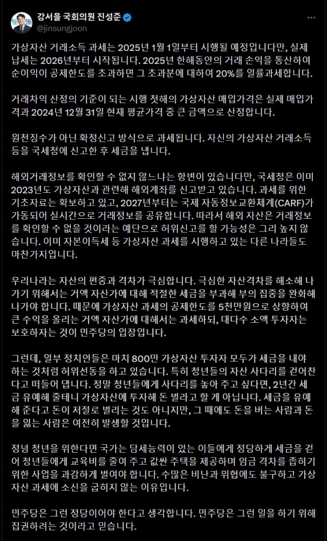 이미지 확대보기진 의원은 27일 X에 "가상자산 거래소득 과세는 2025년 1월 1일부터 시행될 예정입니다만, 실제 납세는 2026년부터 시작됩니다. 2025년 한해동안의 거래 손익을 통산하여 순이익이 공제한도를 초과하면 그 초과분에 대하여 20%를 일률과세한다"면서 "거래차익 산정의 기준이 되는 시행 첫해의 가상자산 매입가격에 대해 "실제 매입가격과 2024년 12월 31일 현재 평균가격 중 큰 금액으로 산정한다"고 과세 기준을 언급했다.