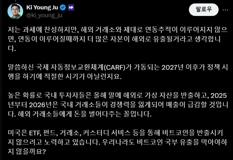 이미지 확대보기주 대표는 "높은 확률로 국내 투자자들은 올해 말에 해외로 가상자산을 반출하고, 2025년부터 2026년은 국내 거래소들이 경쟁력을 잃게되어 매출이 급감할 것이다. 해외 거래소들에게 돈을 벌어다주는 꼴이다"라며 국내 가상자산 거래소의 현 지위마저 흔들릴 것을 우려했다. 그러면서 "미국은 ETF, 펀드, 거래소, 커스터디 서비스 등을 통해 비트코인을 반출시키지 않으려고 노력하고 있다", "우리나라도 비트코인 국부 유출을 막아야 하지 않을까"라고 의견을 더했다.