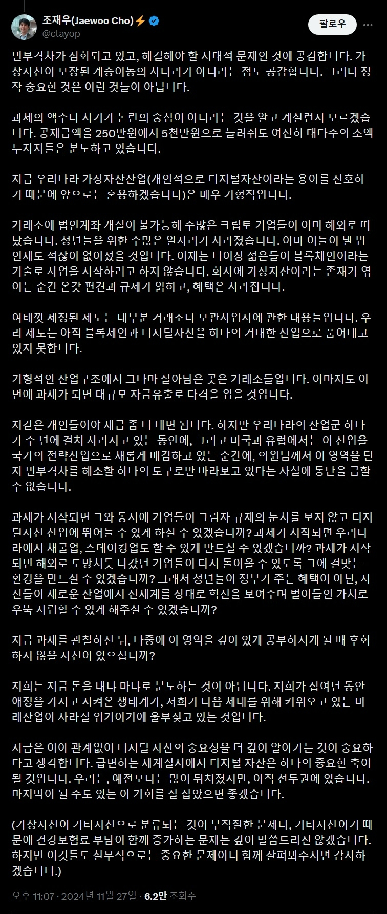또 해외거래 정보를 확인할 수 없지 않냐는 투자자들의 반발에 대해 "국세청은 이미 2023년도 가상자산과 관련해 해외계좌를 신고받고 있다"면서 "과세를 위한 기초자료는 확보하고 있고, 2027년부터는 국제 자동정보교환체계(CARF)가 가동되어 실시간으로 거래정보를 공유한다. 따라서 해외 자산은 거래정보를 확인할 수 없을 것이라는 예단으로 허위신고를 할 가능성은 그리 높지 않다"고 강조했다.