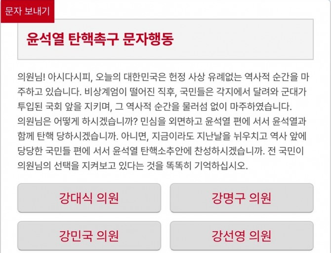 이미지 확대보기방심위는 5일 양천구 목동 방송회관에서 통신심의소위원회를 열고 민주노총이 제작한 '윤석열 탄핵촉구 문자행동' 링크에 대한 즉시 삭제 시정요구를 내렸다. 해당 링크는 접속 인원 1명 당 국민의힘 소속 의원들에게 윤석열 대통령 탄핵소추안에 대해 찬성을 요구하는 내용의 문자를 자동으로 보낸다.
