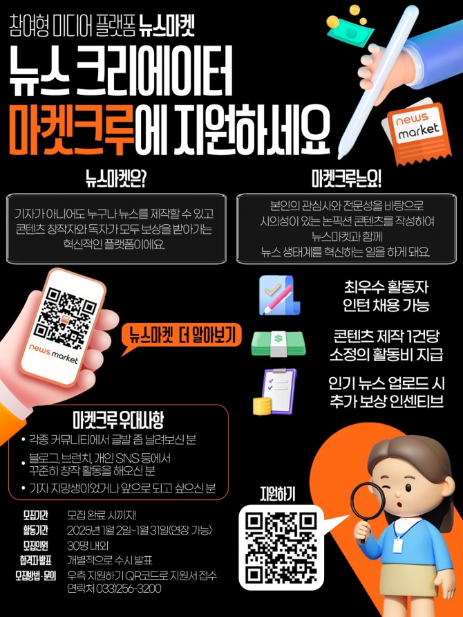 이미지 확대보기뉴스마켓은 기자가 아니어도 누구나 뉴스를 비롯한 콘텐츠를 제작·송출하고 플랫폼 내 인기 지수에 따라 현금 리워드를 보상받는 플랫폼이다. 2020년 창간 이후 온라인 혁신으로 주목받아 온 신생 언론사 MS TODAY가 개발·운영 중이다.