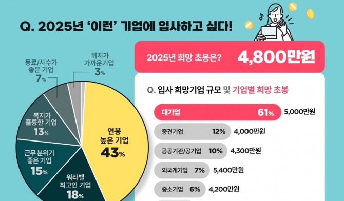 또한, 2025년 구직자 희망 초봉은 ‘4800만 원’으로 나타났다. 기업 규모별로 살펴보면 대기업을 희망하는 경우 평균 5000만 원, 중견기업은 4000만 원, 중소기업은 4200만 원으로 집계됐다. 외국계 기업은 5400만 원, 공공기관/공기업은 4300만 원으로 조사됐다.
