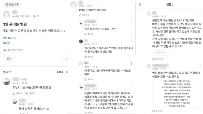 또 인천광역시 중구 게시판에서 '공휴일에 문 여는 병원'을 찾는 글에는 "OOO병원 가보세요", "119에 전화하면 알려줘요"라며 이웃들이 실질적인 도움을 주기도 했다.