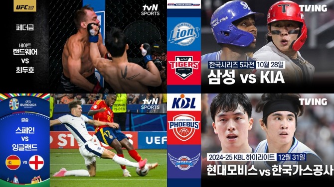 이미지 확대보기티빙에서 만나볼 수 있는 ‘스포츠 명경기 큐레이션 밴드’는 UFC, 테니스, KBO, KBL 등 티빙이 보유한 다양한 스포츠 경기 VOD 중 놓치지 않아야 할 명경기들을 한데 모았다. 스포츠 팬들을 감동과 열광으로 이끈 알짜배기 경기들로 구성된 만큼, 구정 연휴 동안 색다른 감동과 즐거움을 선사할 것으로 기대를 모으고 있다.