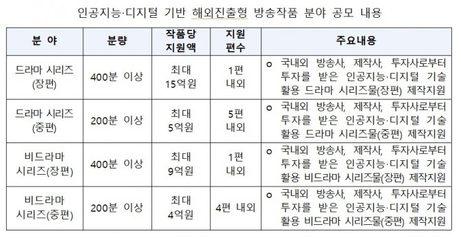 해외진출형 방송작품(콘텐츠) 부문은 드라마 및 비드라마 분야에 방송사 자체보유기술 및 실증 사업을 통해 검증된 인공지능·디지털 기술을 적용해 국제 경쟁력을 강화하고, 칸시리즈 등 해외 작품 시장(콘텐츠 마켓)을 통해 방송작품(콘텐츠) 뿐 아니라 관련 인공지능 기술도 해외시장에 동반 진출할 수 있도록 지원할 예정이다.