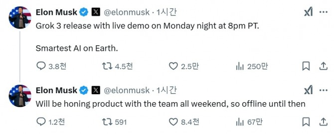 머스크가 예고한 그록3의 출시 시간은 한국 시간으로 18일 오후 1시다.