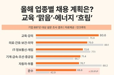 올해 대졸 신입사원 채용이 가장 활발할 것으로 예상되는 업종은 △교육·강의(80.6%)였다. 2023년도부터 꾸준히 70%가 넘는 채용 계획률을 나타냈고, 올해는 80%가 넘을 것으로 예상됐다. AI의 발달과 신산업의 성장으로 교육 분야의 트렌드도 빠르게 바뀌면서 이와 관련한 업종의 신규 인력 수급이 필요한 것으로 보인다.