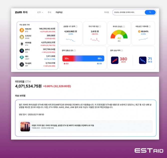 이미지 확대보기AI 가상자산 투자정보 서비스는 기존의 금융 데이터 기반 투자 분석 서비스를 가상자산 시장으로 확장한 것으로, 이스트소프트 자회사 이스트에이드가 딥서치·보난자랩과 협력해 만든 서비스다. 이 같은 가상자산 분석 정보를 접근성 높은 포털 서비스에서 제공하는 것은 줌이 최초다.