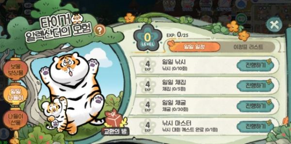 게임 내에선 일일 미션을 수행해 '타이거 헤드 코인'을 모을 수 있다. 이를 알렉산더 테마 인형탈과 말풍선, 코스튬 등 다양한 아이템으로 교환할 수 있다.