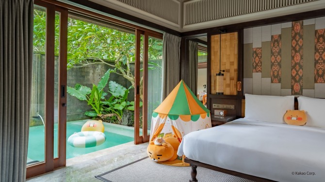 카카오프렌즈는 올해 1월 하얏트의 럭셔리 호텔 브랜드 안다즈(Andaz)와 협업해 '안다즈 발리'에서 특별 패키지 '카카오프렌즈 인 발리'를 선보였다. '발리에 찾아온 카카오프렌즈'라는 콘셉트로, 가든 풀 빌라 객실을 카카오프렌즈 캐릭터 상품과 특별 제작된 어메니티로 꾸며 색다른 경험을 제공한다.