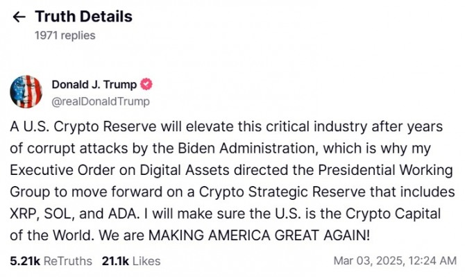 도널드 트럼프 미국 대통령이 3일 새벽, 미국이 암호화폐 전략자산으로 비축할 코인에 대해 언급했다. 트럼프 대통령은 SNS인 '트루스소셜'을 통해 ""미국의 암호화폐 준비금은 바이든 행정부의 수 년간의 부패한 공격 이후 이 중요한 산업을 발전시킬 것이며, 이것이 바로 디지털 자산에 관한 행정명령을 통해 대통령 실무 그룹에 엑스알피(XRP), 솔라나(SOL), 카르다노(ADA)를 포함하는 암호화폐 전략 준비금을 추진하도록 지시한 이유"라고 밝혔다. 이어 "저는 미국이 세계의 암호화폐 수도가 되도록 할 것입니다. 우리는 미국을 다시 위대하게 만들고 있습니다!"라고 강조했다.