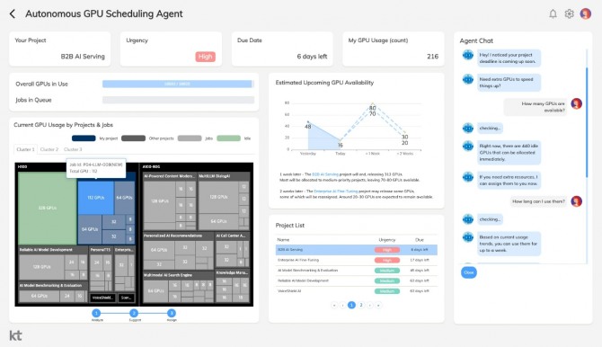 전시 부스에서 관람객들은 대시보드를 통해 프로젝트 정보와 GPU 현황을 확인하고, 에이전트에게 GPU 자원 할당을 요청할 수 있다. 에이전트는 즉시 최적의 할당 방안을 결정하고 실행하며, 유휴 자원이 있을 때는 선제적으로 GPU 사용을 제안해주기도 한다.