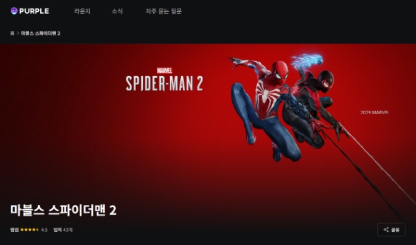 퍼플에선 4일 오전 10시부터 마블스 스파이더맨 2를 구매, 플레이할 수 있다. 피터 파커와 마일즈 모랄레스의 코스튬, 추가 포토 모드 아이템 등을 즐길 수 있는 '디지털 디럭스 에디션' 또한 구매할 수 있다.