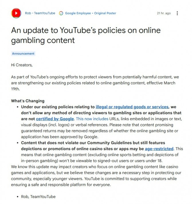유튜브 팀은 "이번 업데이트가 카지노 게임 및 애플리케이션과 같은 온라인 도박 콘텐츠에 집중하는 크리에이터에게 영향을 미칠 수 있다는 것을 알고 있지만, 이러한 변경은 커뮤니티, 특히 어린 시청자를 보호하기 위해 필요한 조치라고 생각한다"고 밝혔다.