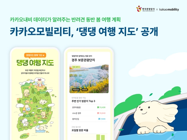 댕댕 여행 지도에는 각 여행지별 사진과 함께, 카카오내비 길안내 사용자 수 기준으로 △각 명소의 '요일별 방문 비율' △반려동물과 함께 방문할 수 있는 '주변 인기 방문지 TOP3' △방문지별 특징을 담은 '해시태그' 등 유익한 관광 정보도 함께 담아 이용자들의 여행 코스 계획 수립을 도울 예정이다. 해당 정보는 봄 나들이 시즌인 점을 고려, 지난해 3월 1일부터 5월 31일까지 3개월 간의 이동 데이터를 종합적으로 분석한 결과를 활용했다.