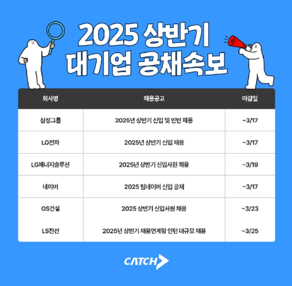 이미지 확대보기채용 플랫폼 진학사 캐치는 2025년 상반기 주요 대기업에서 신입·인턴 공개채용에 돌입했다고 12일 밝혔다. 채용을 진행하는 곳은 삼성그룹·LG전자·LG에너지솔루션·네이버·GS건설·LS전선 등이다.
