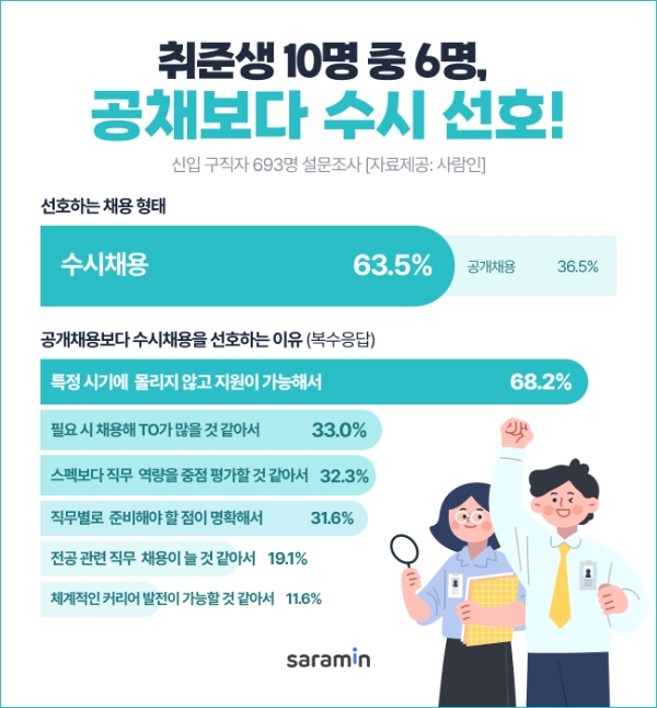 이미지 확대보기12일 커리어 플랫폼 사람인에 따르면, 구직자 693명을 대상으로 '선호하는 채용 형태'를 설문 조사한 결과 신입 63.5%가 공개채용보다 수시채용을 선호하는 것으로 나타났다.