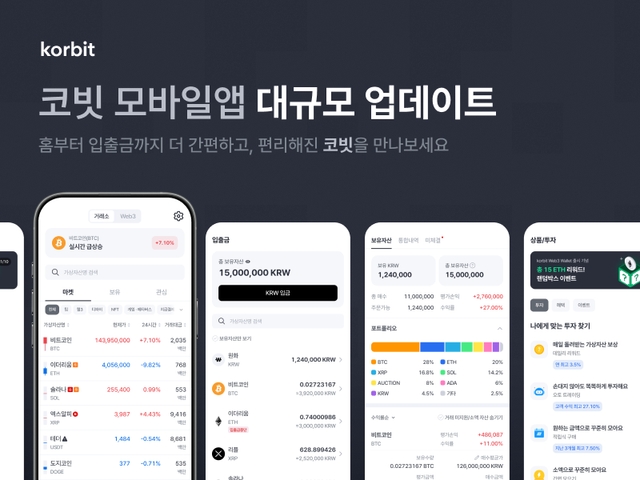 이미지 확대보기이번 앱 업데이트는 가상자산 거래에 꼭 필요한 핵심 메뉴인 '홈’, '자산', '상품/투자' 화면을 전면 개선하고, '입출금' 탭을 메뉴에 추가한 것이 특징이다. '홈' 화면과 '상품/투자' 화면에서는 코빗의 주요 서비스를 빠르게 이용할 수 있도록 편의성을 강화했다.