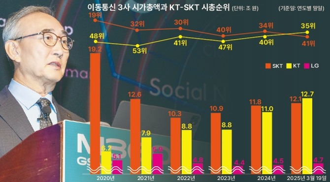 이미지 확대보기21일 한국거래소 종가를 살펴보면 KT의 시가총액은 12조5381억 원으로 SK텔레콤(12조927억 원)을 추월했다. 이는 지난 2020년 말 KT 시총이 6조2667억 원에 불과했던 것과 비교해 두 배 이상 급증한 수치다. 주가도 약 15년 만에 5만 원을 돌파했다. KT가 5만 원을 넘은 것은 역대 최고가인 2010년 2월 1일(5만1200원) 이후 처음이다.