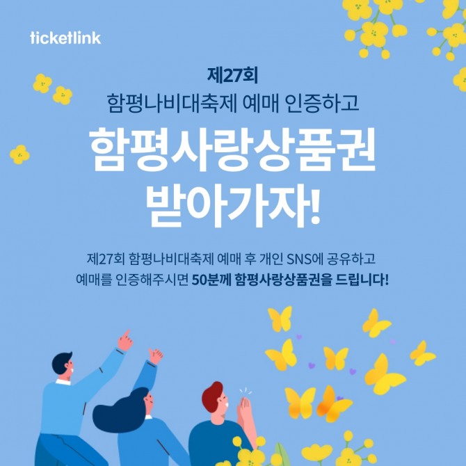 NHN링크는 함평나비대축제를 더 풍성하게 즐길 수 있는 예매 인증 이벤트를 마련했다. 행사 예매 후 개인 SNS에 공유하고 이를 4월 23일 오후 5시까지 인증하면 이벤트에 참여할 수 있다. 추첨을 통한 50명에게 함평사랑상품권 2만원권을 선물한다.