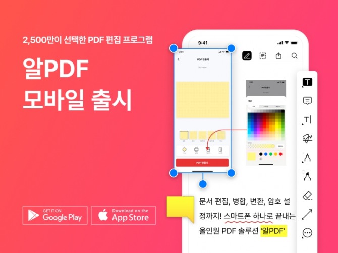 이미지 확대보기'알PDF'는 2500만 유저가 선택한 '알툴즈' 제품군 가운데서도 높은 인기를 얻고 있는 PDF 편집 도구로, 이번 모바일 버전 출시는 PC에 이어 모바일에서도 사용자의 문서 생산성 극대화를 돕고자 진행됐다.